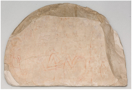 The village of Deir el-Medina was active throughout the New Kingdom (from the Eighteenth to the Twentieth Dynasty, 1539–1076 BC). It housed the workers employed to build the tombs in the Valley of the Kings and the Valley of the Queens. The stele was discovered during the 1905 campaign of the Italian Mission led by Ernesto Schiaparelli at Deir el-Medina, and was brought to the Museo Egizio in Turin in the framework of the sharing system (“partage”) regulating foreign excavations in Egypt at the time. Its provenance has been repeatedly stated to be chapel D in the sanctuary of Meretseger, south of the village along the path between Deir el-Medina and the Valley of the Queens [1,2]. However, the stele’s “high” inventory number suggests, on the contrary, that it does not belong to the lot of objects excavated here by the Italian Mission, which only encompass nos. S. 5987–6067 [3]. A provenance from the excavations conducted north of the village, in the area of the Ptolemaic temple, seems more likely [4].