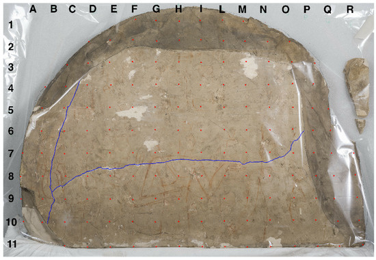 The object of this study and analysis was the limestone stele S. 6145 (see Figure 1), a large fragment of wall decoration measuring approximately 100 × 100 × 15 cm3 coming from Deir el-Medina and belonging to the Museo Egizio collections. The stele shows numerous traces of red figures and hieroglyphs that appear to be faded and almost illegible, a preparatory drawing for carving in relief. At close observation the lower side of the artifact appeared to be crossed horizontally by a long crack, following the sedimentary stratification of the stone. This crack intersected the figures and threatened their preservation.