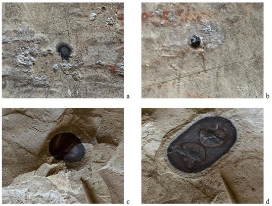 Chert nodules, millimetric in size, on the front of the stele (a,b). Chert nodules, centimetric in size, on the reverse of the stele (c,d); the second one contains two smaller nodules (d).