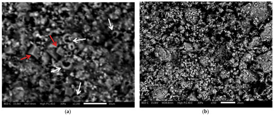 Electron microscope image (SEM backscattered electrons) of: (a) sample 1; the fine grain size of the micrite crystals is clearly visible; white arrows: micropaleontological content (coccoliths); red arrows: dolomite crystals; (b) sample 2, microscopic aspect: micritic crystals and euhedral crystals.