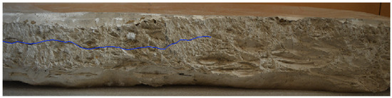 In addition to the closed microfractures described above, the stone material constituting the stele has a crack extending across the entire width of the stele. Its development and direction were influenced by the sedimentary structure of the limestone. By observing the object from the side, one can indeed see that the fracture is substantially parallel to sub-parallel to the barely visible stratification of the limestone (Figure 7).