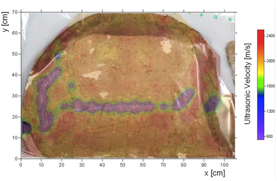 The ultrasonic test yielded medium-high velocity values (approximately around 2200 m/s) for most of the stele but also evidenced a localized reduction in the velocity (to about 1000 m/s). The velocity distribution along the stele evidenced a very good correspondence of the low-velocity area (blue–purple area in Figure 8) with the known location of the main visible fractures on the surface of the stele (see Figure 2). No other specific low-velocity zones were observed. The relevance of this low-velocity area and its particularly low-velocity range allowed us to establish a significant persistence of the fractured zone, which can be regarded as a warning of the existence of a threat to the integrity of the stele, particularly during handling.