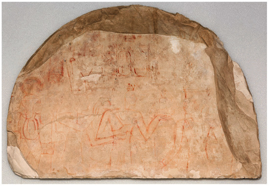 - Spoladore, A. The stele S.06145 from the village of Deir El-Medina and conserved in the Egyptian Museum of Turin: Handling, Reading and Conservation Problems. Master’s Thesis, University of Turin, Venaria Reale, Italy, 25 November 2019. [Google Scholar]