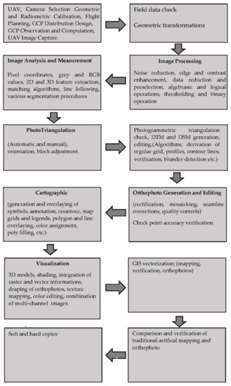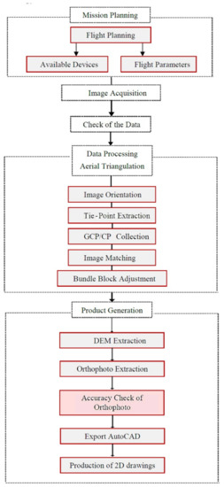 Typical image-based aerial surveying with UAVs requires mainly to decide the project parameters, field work including mission planning (project parameters, flight planning), image acquisition, data processing and product generation (Figure 8).