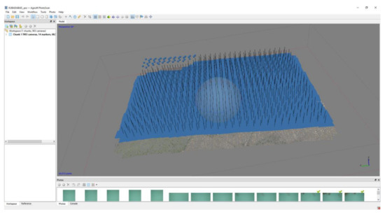 In this study, for aerial image processing, PhotoScan 1.1.5 was used. Image alignment was carried out with 859 cameras (Figure 10, Figure 11, Figure 12 and Figure 13) and 14 GCPs (Figure 14). The coordinate system of the project was selected TUREF/TM 33 (EPSG:5255). The images were aligned with 68,572 tie points and 14 GCPs (Table 2).