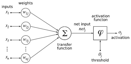The architecture of artificial neural networks is composed of artificial neurons, which try to replicate the concept of a biological neuron that receives different inputs; the inputs are combined with their internal state and with a predetermined optional threshold using a certain activation function; the output is produced using a different function (Figure 1). The network also consists of connections; each connection transmits the output of a neuron as an input to another neuron, and a weight value is assigned to each link by the emitting neuron which determines the importance of that link [41,42]. Each neuron can have multiple input and output connections. The propagation function computes the input of a neuron from the output of its predecessor and its connection as a weighted sum. To this can be added a further term bias.