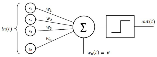 The percepter is an algorithm for the supervised learning of binary classifiers of artificial neural networks [43,44]. The binary classifier is a function that can understand when an input, represented by a vector of numbers, belongs to a certain class. It is therefore a linear classifier that makes its predictions based on a linear prediction function by combining a set of weights with a vector of characteristics (Figure 2). Single-layer perceptrons are capable of learning only linearly separable patterns. Perceptrons with a second layer are used for complex classification tasks, which are able to solve many problems otherwise solvable with separations.