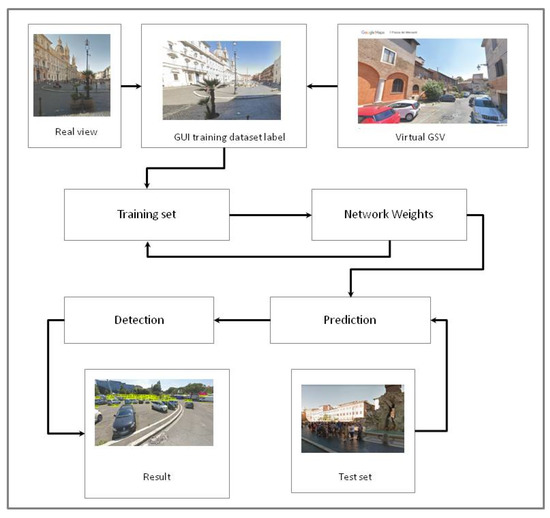 As per Table 1, two significant sample images were collected and processed for each square. The images processed in this work through machine vision techniques were all virtual; it is possible to use the same method even with real images taken in a different time frame [25]; for the analysis of temporal comparison [26], it is important that the framing of the scene is always the same [27,28,29]. The choice of the most suitable network for training in the specific application domain focused on convolutional neural networks (CNN), which are a regularized version of the multilayer perceptive networks, also defined as deep neural networks [30,31,32,33,34]. Deep learning is an important part of machine learning, and deep learning algorithms rely on neural networks. Below are the general and CNN-specific features of a machine learning network [35,36].