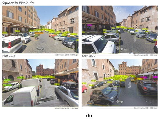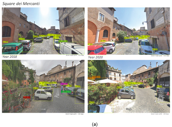 The square, used as a place of sociality and collective recognition, played an essential role in the Middle Ages in the urban scenario, where people met in a space rich in history and art, sharing daily life in its various aspects (economic, religious and political); the images of Piazza dei Mercanti and Piazza in Piscinula confirm a change (Figure 4a,b. The elaborations of Piazza dei Mercanti in 2018 featured 29 parked cars, 2 vans, 1 bicycle, and only the presence of 1 person. The situation is similar in 2020, with 25 parked cars and 2 umbrellas; with an area of about 711 square meters, we can estimate a percentage of about 25% of the square being designated for parking spaces for parked cars.