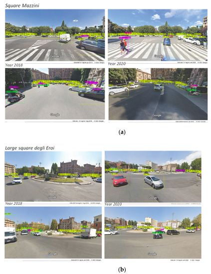 Square Mazzini (a) and Large square degli Eroi (b), respectively, with two acquisitions from the years 2018 and 2020.