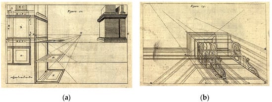 In the seventeenth century, the mathematician Girard Desargues (1591–1661) developed the basic concept of the principle of projection and section view proposed by the Renaissance artists. In 1636, this scientist derived his famous “perspective theorem,” which states: “When two triangles are in perspective, the points where the corresponding sides meet are collinear.” Desargues’ most important work Brouillon projet d’une atteinte aux événemens des rencontres d′une cône avec un plan (proposed draft for an essay on the results of taking plane sections of a cone) was printed in 1639, where Desargues presented innovations in projective geometry applied to the theory of conic sections. With this work he founded the use of projective methods in geometry, inspired by the theory of perspective in art. Additionally, the Italian Jesuit Andrea Pozzo (Appendix A, A1) (1642–1709) published Perspectiva, Pictorum et Arquitectorum between 1693 and 1698, which argued for perspective drawings based on the two orthogonal projections of an object. The first volume became the most widely published and translated treatise on perspective written to date in 1693. At the end of the first volume, Pozzo included an answer in response to those who advocated the use of multiple viewpoints within a perspective illusion. For the most part, Pozzo employed a single point of view in his quadratura works (Figure 1a,b).