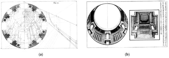 The role of China in the historical development of graphics declined during the Ming (1368–1644) and Qing (1644–1911) dynasties. In these periods, various European missionaries came to China and used the Western perspective. The painters among these missionaries applied the focus perspective in drawing by furthering the landscape and strong stereo feelings, which attracted the attention of the scholars of pictorial works of the Qing dynasty. These scholars absorbed the theories and techniques of western drawings and paintings and disseminated them. Thus, Nian Xiyao (?–1738), high Commissioner of the Ministry of Works during Yongzheng’s reign (1678–1735) became a collaborator of the Jesuit missionary G. Castiglione. Nian Xiyao compiled and published his book Shi Xue (Appendix A, A2), (Study of Vision), which illustrated the basics of illusionist paintings and architectural techniques on perspective drawings [7]. The publication of the two versions of Shi Xue can be recognized as “excellent work and the first of its kind in the history of graphics in China” [6] (pp. 108–120). Nian specifically acknowledged Castiglione for his continuing instruction in the art of the European linear perspective. Nian adapted Pozzo’s designs for a trompe l’oeil cupola, although in the process of copying, the details were greatly simplified and many elements were combined or eliminated (Figure 2a,b) [8].