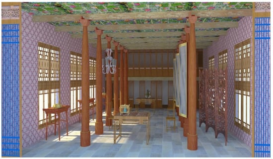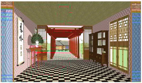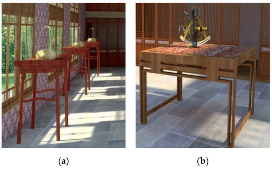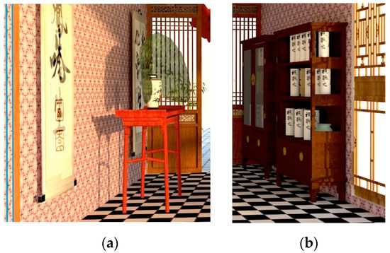 As can be observed in these two representations (Figure 4 and Figure 5), the traditional oriental aesthetics attempted to capture the enigmatic world of the shadow. When these effects were suppressed, the beauty lost its magnificence. In the simulated architecture there were lots of descriptions of the lateral decoration. Some objects, typically Chinese, were identified and located on the walls: calligraphic scrolls, and two large bookshelves (Figure 7b). These representations ensured a pleasant visit to a hypothetical observer exploring the width and length of the room. In [22] Ishida writes: