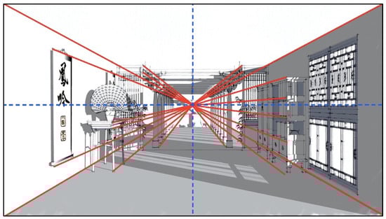 The innovative pictorial effect of the linear perspective marked a before and after, and it could create an optical illusion between the two walls and their pictorial representations. However, turning the eyes completely to the right or left, perpendicular to the wall, the two perspectives appeared as a frontal perspective, also called a “one-point perspective”. According to Ishida, Lang Shining managed to create a deep illusionistic architectural design by making physical walls disappear. This was a well-known perspective of the Renaissance, one that positioned the parallelepiped volumes of the architectural painting with one side parallel to the mural [1]. The sidewalls were perpendicular to it and their edges appeared to converge into one single vanishing point (Figure 6). The drawings were a frontal perspective drawn from a station point in front of the east and west walls. The prolongation of supposedly perpendicular lines to the walls indicates the location of the principal point, the orthogonal projection of the station point to the picture plane, and the position of the horizon line.