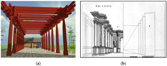 In order to understand the dynamic of the linear mathematical perspective transmission process to East Asia and its application to architectural painting, there is a need to start with some important antecedents. According to Rossi, “a rich bibliography includes research on its mathematical essence, the role it has played in the representation and history of architecture, its use in theatres and the various projective applications to measurement and representation of surfaces” [1,2]. As a scientific topic in general, perspective traditionally involves various disciplines that are easily distinguished by the specific nature of their approaches. Art history, architecture, mathematics, descriptive geometry, drawing, stage design and other more technical fields of knowledge have applied geometric principles to the solution of practical problems [1] (p. 578). The architectural perspective, culminating in the technique of quadratura, appeared to be exclusive to Italy and was very widespread between the sixteenth and eighteenth centuries [3,4].