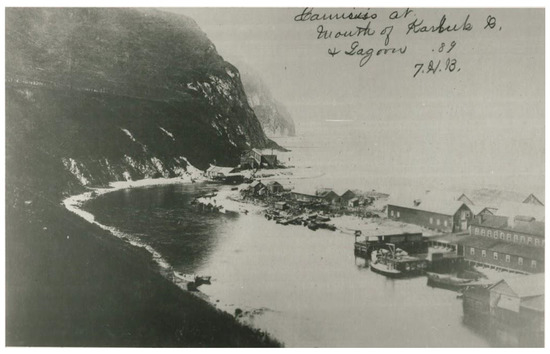 When Russia sold Alaska to the United States in 1867, Alutiiq lives were in peril. The Karluk River on the west side of Kodiak Island, one of the richest salmon streams in the world, had long been used as an exploitable fishery resource by Russians and Americans. The first cannery in Karluk was established in 1882 (Figure 2). Salmon, the staple of the Alutiiq diet, became a highly desired commodity, feeding the American economy. The industrial expansion of the salmon fishery quickly led to overfishing and a dramatic decline in salmon resources that had supported Native families for generations [1].