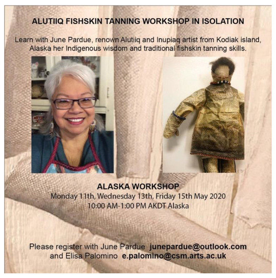 A means of responding to the critical issues posed by the COVID-19 lockdown emerged in the proposal to co-host an online fish skin tanning workshop with June Pardue, a highly respected Alutiiq and Inupiaq artist from Kodiak Island, Alaska (Figure 4). Meeting in 2019 at the Smithsonian’s Arctic Studies Center in Anchorage, Alaska, Elisa and June stayed in touch by social media. As educators, the lockdown presented similar problems in engaging students, both in Alaska (for June) and in London (for Elisa).