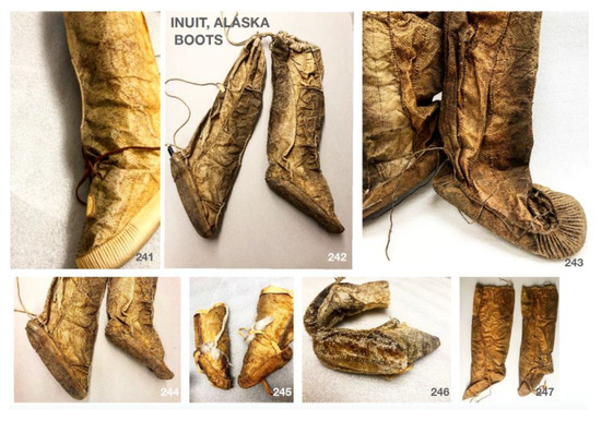 During the workshop, Elisa introduced a series of fish skin artefacts from archives and museum collections around the Arctic that she has studied during her previous fieldwork (Figure 6). These objects, created by artisans throughout the nineteenth and early twentieth centuries, reveal Arctic peoples’ intimate relationship with their environment through fishing and skilfully processing the fish skins. Fish skin objects from the Arctic and Subarctic regions reflect everyday items of clothing, bags, boots, mittens and skin scrapers for preparing hides. Today, these artefacts are highly valued and sought after by the native descendants of those who created them for their artistic value, craft and representation of cultural development and humanity adapting to a wide range of environmental conditions [14].