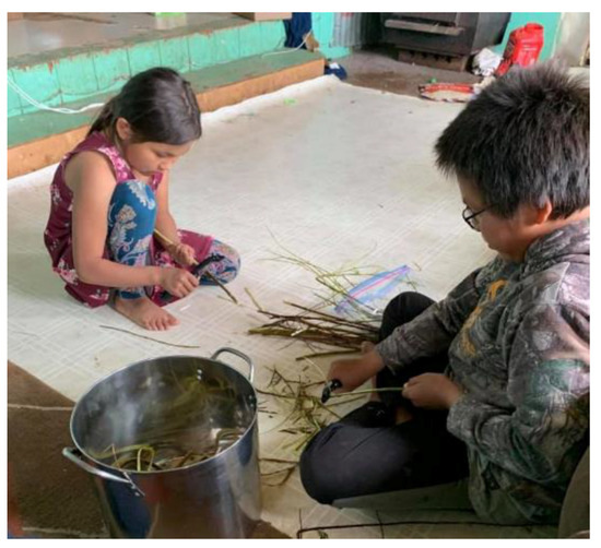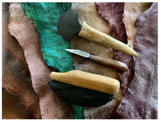 During the initial workshop, June instructed the participants in using a bark solution to tan the skins. We peeled the outer part of the tree branches with a potato peeler (Figure 11). As June noted, the middle part is not used since it is full of sugar and it will ferment the tanning solution. Peeling four organic beets, we added them to the tanning solution to soften the fish skin. This provided a beautiful red tone (Figure 8). We placed the bark and beet peels into a pot and poured water to fill the pot, bringing the tanning solution to a boil. After adding a spoonful of non-iodine salt to the tanning solution, the mixture of bark and beets was simmered for 5 h and then left to cool overnight.