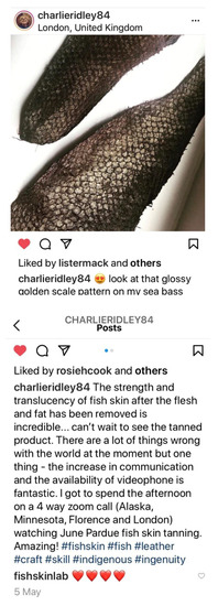 One the biggest challenges the COVID-19 emergency has created has been how to teach studio-based, hands-on courses online. Although universities around the globe have suspended classes and transitioned to remote teaching, distance learning is not easy for students who learn by making, requiring access to studios and workshops. As a response to digitalised education, Elisa wanted students to learn a new craft and start working with their hands again. Craft-based skills need to prevail in the context of massive digitalization during this specific period in history. Craft has the power to stimulate, inspire and soothe us—an important reason to keep making with our hands through this difficult period. Although online craft courses are not a new phenomenon, this fish skin platform offered possibilities for students from a range of backgrounds and nationalities to come closer despite the physical distance. Technologies such as Zoom online classes have helped to resolve contemporary issues, including the lack of connection during lockdown. Furthermore, lessons learned in lockdown will be imbedded into their practice for good.