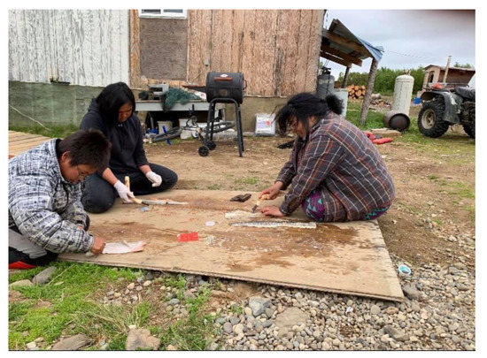 Ancient shamans drew inspiration from nature, harmonising the fire, water, earth and air elements to navigate perilous times. In times of disorientation, distress and challenge, such as the COVID-19 pandemic, it is crucial to reinstitute balance by reconnecting with nature. The fish skin tanning workshops provided a creative practice to help participants through these challenging times, strengthening their intimate connection with nature while also benefiting the greater community. The increase in communication and involvement of individuals from different backgrounds and areas of expertise across the planet during the COVID-19 lockdown enabled a closer connection with each other and with nature. Along with climate change, the pandemic crisis has brought a shift in perception of nature and the role of humanity as a responsible keeper. Arctic Indigenous Peoples have a lot to teach in this respect. In recent years, governments have tapped into traditional Indigenous knowledge preparing for and responding to nature disasters and health crises. As Clement [23] points out, the idea of traditional Indigenous knowledge and resilience comes from paying attention and being a part of one’s environment, thereby gaining experience and learning from it collectively.