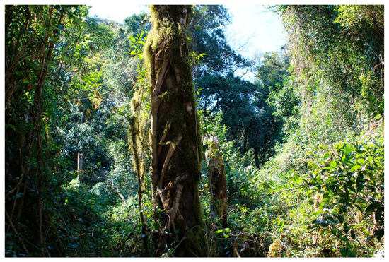 Thathe sacred forest is one of the few remaining, largely undisturbed moist forests in southern Africa [32] (Figure 3). The original extent of the sacred forest before commercialisation is unknown. Surrounded by the villages of Vondo, Tshidzivhe and Tshilungwi, and commercial timber plantations, what remains of this sacred forest is about 3807 hectares [32]. Thathe is a botanical reserve that falls within the northern mist belt, receiving annual rainfall of approximately 1500 mm [32]. The vegetation found therein is of subtropical provenience. Its tall and diverse trees are multi-layered, with a well-developed canopy (Figure 3).