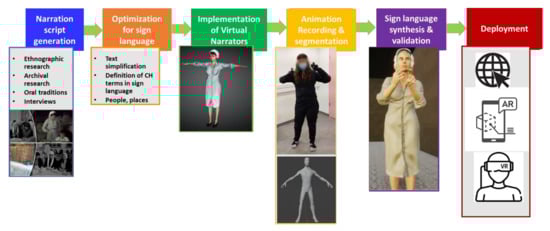 The proposed methodology is comprised of six sequential steps, as shown in Figure 1. The methodology has been developed in the context of the Mingei project, targeting the representation and presentation of Heritage Crafts [66]. In the first step, the narrative is authored by CH professionals based on several research methods that could include archival research, ethnography, interviews, etc. The script is reviewed by the sign language translators and is optimized for oral sign language presentation. Then, the VHs are implemented considering the characteristics of the personality narrating the story (e.g., age, gender, occupation, historical clothing, etc.). Then, the narration is recorded using a motion capture suit and gloves, both in sign language and orally. In the oral recording, the narration audio is also recorded. Then, the segmentation occurs to identify possible reusable parts of the recording to be integrated into the sign language vocabulary. The resulting animations are imported into a 3D game engine and retargeted to animate the virtual narrator, with the animation sequence defined by the recorded animation file. In this stage, the resulting retargeted animations must be validated by sign language translators to assess their accuracy and readability. Finally, as the resulting animations can be exported again in fbx format, these can be employed to augment the content of various 3D applications delivered through a standalone application, the web, mobile devices, and VR.