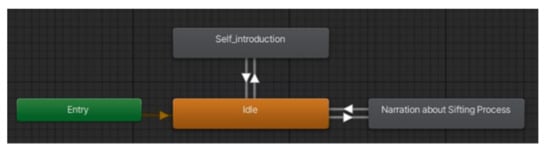 To do so in this research work, the import of the narration animations and the VHs into the Unity game engine is proposed. After that, add the VH to a scene and define an animator component to control their animations. The controller defines which animations the VH can perform, as well as when to perform them. Essentially, the controller is a diagram, which defines the animation states and the transitions among them. In Figure 2, an animation controller is shown where the VH initially performs an idle animation; it can then transit (arrows) to a state where the character introduces herself (“Self-introduction”) or to a state where she narrates a specific process (“Narration about Sifting Process”). At the end of this step, a VH with all the integrated animations of the narrative is available. In the case where the oral narration is also recorded, this is also integrated into the final model. For ease, a script in JSON format is created for the orchestration of animation sequences.