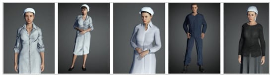 The virtual human bodies and clothes were created to obtain one unified and optimized model, enhancing the visual impact of the characters with texture mapping and material editing. The 3D generation of the virtual bodies also has to take into consideration the total number of polygons used to create the meshes to keep a balance between the 3D real-time simulation restrictions and the skin deformation accuracy of the models. In this use case, avatars were created with a combination of different software: Adobe Fuse CC/Mixamo [71] was used for creating the body character, the clothes, the hair, and the rigging. The generated model was then imported into Autodesk 3DS max [72] for mesh geometry optimization.
