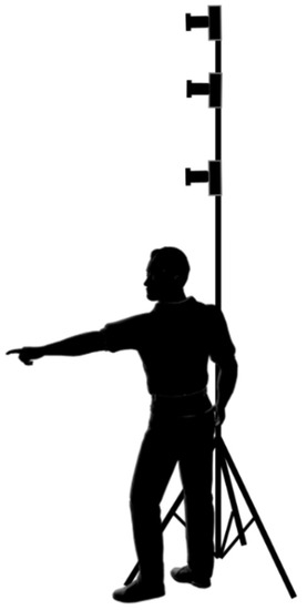 The pre-production phase of the pipeline had to ensure that the restrictions that were imposed on the shooting inside the tower were not insurmountable, since the rest of the lines of work could be readily controlled. After a process of documentation and deliberation about the different possibilities, it was concluded that the only certain method of covering the surfaces in such a short time and without lighting aids was to use a vertical rig of cameras shooting simultaneously (See Figure 2). The preparation of each shot would take more time, but if properly synchronized, the total time required could be divided by the number of cameras used. Initially, calculations were made for a vertical rig consisting of four mid-range DSLR cameras anchored to a rigid, telescoping pole on a tripod. The path of the rig would be parallel to the walls in different passes at different distances, and the relative position of the cameras on the rig would be changed to obtain segments at different heights. According to the specialist literature, this approach has rarely been used for photogrammetry projects and it is much more common to find stereoscopic approaches using two cameras [3,32].