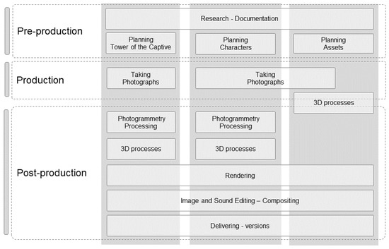 This project was approached in three phases that are not necessarily sequential or consecutive: pre-production, production, and post-production. Based on approaches used in the audiovisual industry, these phases were applied to a script and focused on different aspects: inside the tower, obtaining the characters, and the creation of assets. While it is clear that careful preparation is required, as reflected elsewhere in the literature [42,43], phases such as Data Capture, Data Processing and Output Presentation can sometimes be found, which either do not consider shot preparation as a relevant step or do not include it in their first stage [17,29,30,31,33]. Due to the importance of the decisions that had to be taken in the preparation of the workflow, it is established here as a singular phase, while the presentation of the final result is included in post-production as one of the processes that usually make it up [44].