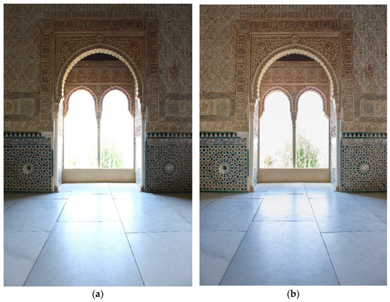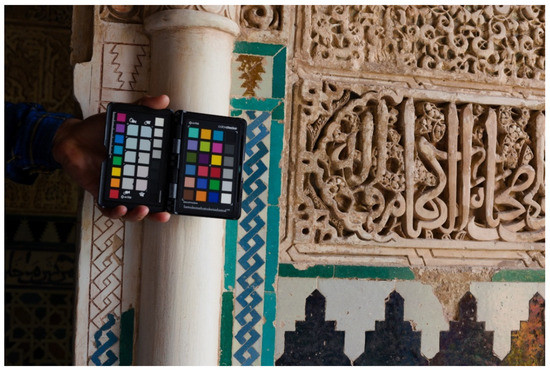 In cinema, a scientific approach to questions concerning the control of color and exposure when shooting has long been employed. It is common for all image- and video-editing programs to implement procedures with externally calibrated measurements [45], using very accurate meters and different procedures to control EVs, as well as employing Color Checker. These procedures, which are also described in the literature specialized in photogrammetry [29,45] were used in this project to solve the color-characterization problem and to avoid occlusions due to exposure problems. By obtaining RAW and compressed JPEG files simultaneously, a safety margin was established in the acquisition that neutralized the risks associated with working with natural light. In fact, during the days of data capture, the sky was very cloudy in Granada and at times quite dark. The use of RAW files allowed us to vary the exposure values and, to some extent, to correct the fluctuations and prevent over- or under-exposure.