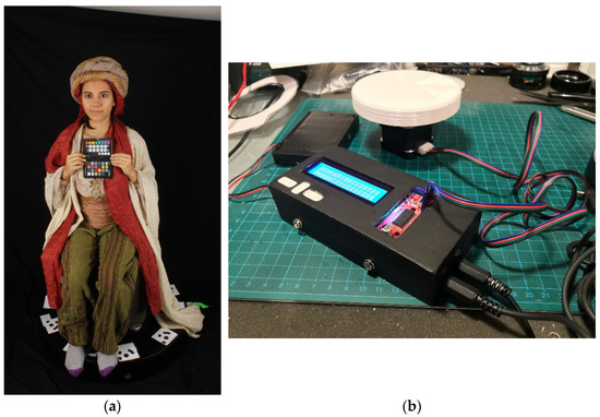 To obtain the images of the characters, a setup was made with a turntable with tickers to mark control points, a lighting installation with four flash-type fixtures (4 Linkstar DL-500D) and three vertical rigs of five Canon EOS 1200D cameras each [29]. Once characterized with period costumes and styling, the models were asked to pose as still as possible while the giratutto was set in motion. After photographing the Color Checker, a shot was taken every 30 degrees (Figure 5a), synchronized to the photographic flash lights through an Arduino ad hoc setup (Figure 5b) and triggering the 15 cameras simultaneously. This was done with two poses of the six different models, sometimes changing the characterization. Finally, the shots of three characters were used, one of them in duplicate.