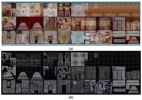 With careful planning of the photographic sessions, the photogrammetry software can produce a geometry with sufficient detail and with textures that are true to the original surfaces. Once the cloud of points was obtained through photogrammetry, simplifying the mesh proved to be useful for the subsequent tasks, as recently noted elsewhere [17,29]. However, there are programs available that specialize in this type of task, such as Zbrush, which recreates the mesh in a much simpler form through a process known as re-topology. As a result, the mesh was eventually reduced to about 200,000 polygons. This process was necessary for two reasons: first to restore areas that have been left with little or no detail [17], which in our case affected the corners of the floor and some small interior sectors of the balcony arches; second, it offers the possibility of creating clean UVs in order to obtain masks that extend the resolution of the textures using multi-UDIM. If the program originally generated an 8K texture for each room, through this procedure it was possible to have that resolution for each of the maps that were generated, 27 in total (see Figure 8a).