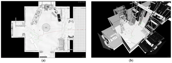 (a,b). Craftsman scene in plan (a) and perspective (b) views in wireframe render. It is crucial to arrange the elements to be able to work interactively with quick previews within the layout of the scenes.