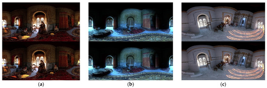 Following the script, the scenes of the present day, the night storm, the artisan and the captive were composed, while fine-tuning the light and camera animations and creating transitions between them. With a previous low-quality rendering, the sound program was created, and the voiceover, music, effects and Foley were adjusted. This task, together with the sound synchronization, was performed using DaVinci Resolve 16. This program was also used to perform the final rendering at a resolution of 4096 × 4096, with Quick Time output format without YUV 4:2:2 compression. A conversion to the 360° 3D stereoscopic format of the BT (Bottom-Top) type was performed so that it could be experienced with Oculus Rift glasses, with an appearance similar to that shown in Figure 12a–c.