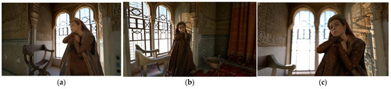 Shading and look-dev processes are crucial for making the scenery, assets and characters appear photorealistic on screen, but lighting and environmental effects are also equally important. In this project, a detailed study of each character in the environment, light and optics was carried out (see Figure 13a–c), and such a challenge requires a lot of time with conventional methods, so it is recommended, after the experience, to use a rendering engine for testing.