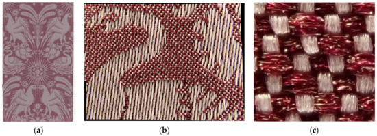 Photographic documentation focused on museum exhibits that have unique historical value. More specifically, we took photos of patterns in books, paintings, manuscripts, garments, and fabrics, as well as close-up photos of the various parts of the looms. The photographs collected comprise about 20 textile manufacturing documents with instructions, 110 overview photographs of looms and HdS workshops, 80 loom detail photographs, 10 photographs of silk threads, 50 photographs of plants used in the manufacturing of color pigments, and 5 sets of photographs of detailed ecclesiastical garments (about 800 photographs). For the acquisition of ultra-high-resolution scans of textiles, a contactless scanner was used, [68], that is a cost-efficient alternative to off-the-shelf solutions and provides micrometer scans with a resolution of 19.8 Kppi. Results can be seen in Figure 5.