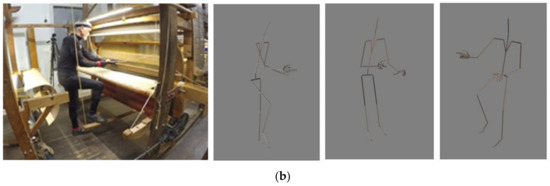 The recording of a human expert was performed during silk weaving. More specifically, the expert was recorded as he went through the different stages of the loom and silk preparation, as well as the weaving process itself. For acquiring video documentation, in terms of equipment, we used three cameras for data acquisition: one digital camera (Nikon J1) with a 10–30 mm lens that captured single images of resolution 3872 × 2592, as well as full HD (1920 × 1080) video at 60 fps, and two GoPro cameras with an ultra-wide lens capable of 2.7 K (2704 × 1520) video footage at 70 fps. To ensure that the footage is free of motion blur, we captured the scene at a high frame rate, and additionally used tripods and a gimbal. Videos in high resolution at a high frame rate were captured from various viewpoints to ensure an unobstructed view of the expert that can be used to perform pose estimation of the human hand and body and extract the motion patterns of the expert. The latter type of data acquisition posed several challenges. Due to the physically tiring process of operating a heavy loom by a single expert, only a few repetitions of each task in the weaving process could be performed and recorded. A second challenge was the size and positioning of the looms. State-of-the-art 3D human-pose-estimation algorithms for visual data are typically trained using frontal full views of human bodies, where major identifying features of the body (face, arms, fingers) are visible and self-occlusions are limited. For instance, having two different frontal views of the body during the weaving process would have been ideal. In the case of the weaving room at Krefeld, all of the machines have several moving parts, are positioned and mounted on walls, and occlude the front side of the expert, making it impossible to capture frontal views of the body. We ended up recording the expert using back views of his body, from specific angles so as to be able to simultaneously capture his body and his feet, which play an active part in the operation of the looms pushing against pedals and levers. The capturing procedure resulted in a dataset of approximately 100 GB of pictures and videos where we recorded the artistic procedures of painting and selecting the tiling patterns, punching cards compatible with the Jacquard looms, the preparation (winding and unwinding) of silk, and the final weaving procedure.