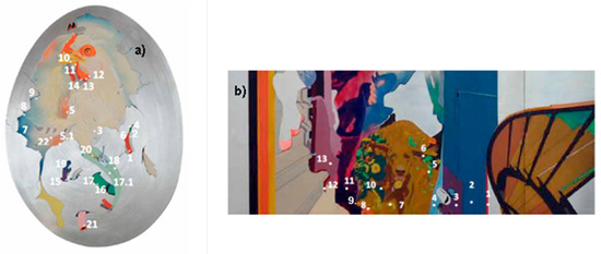 In “The Daily Neo-Mythology”, the acrylic binder could be recognised in the MIR spectrum based on signals at 1736, 1446, 1382, and 1160 cm−1 [3,27] (Figure 11b,c). Among the examined areas, just in the blue detail NQ2 nitrocellulose could instead be detected (Figure 11a).