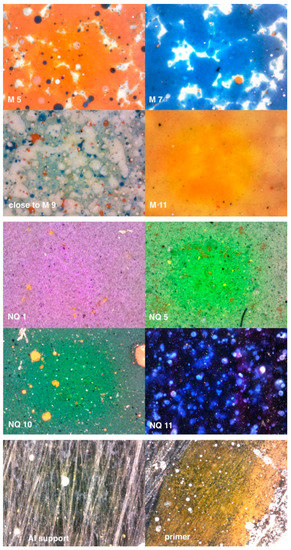 As for the pictorial technique, both works examined are painted on aluminium panels. The Segrate frieze, in particular, consists of separate panels placed side by side and hooked on the back, each made as a sandwich structure, where two aluminium sheets about 1 mm thick are separated by an internal wooden frame. As observed and also confirmed by Pasotti himself during a series of meetings that preceded a recent exhibition dedicated to him [9], the aluminium surface of the support was brushed in most of the areas to be painted so as to become rough and ensure better adhesion of the paint. On the contrary, it remains smooth in unpainted areas. Then, a light brown paint base was applied as a primer. The subsequent painting was applied by spray, generally without overlapping between the different colours. Despite the probable use of cardboard masks, useful to avoid dirtying the adjacent backgrounds, at high magnifications (50–230×) small scattered drops of colour can be observed that encroach on the neighbouring areas, without significantly changing the final tone (Figure 3, M5 and M7). In some cases, on the contrary, the spraying of one colour on the other is desired by the painter to obtain a blurred effect in terms of colour (Figure 3, image “close to M9”).