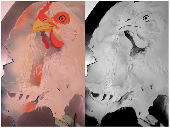 “The Monster”: the same detail under (left) visible diffused light ad (right) IRR. The first version of the chicken, a larger one, can be seen in the IRR.