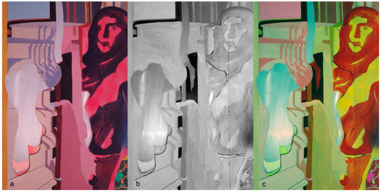 “The Daily Neo-Mythology”, right panel: the same detail seen in (a) visible diffused light, (b) IRR, and (c) IRFC.