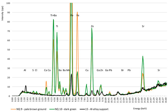 ED-XRF could detect very small amounts of Cu, which also belong to the Al alloy, but at least in one point, NQ10, where the green is darker (i.e., more concentrated) a higher intensity of Cu was measured (Figure 6, green spectrum).