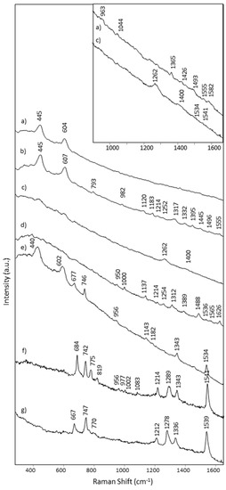 Raman spectra (λexc = 785 nm) of areas: (a) orange M10; (b) red M14; (c) violet M15; (d) yellow NQ7; (e) blue M9; (f) green NQ6; (g) green M4. The inserted box shows an enlargement of spectra (a,c) to highlight some weaker bands.