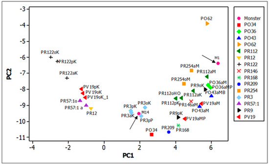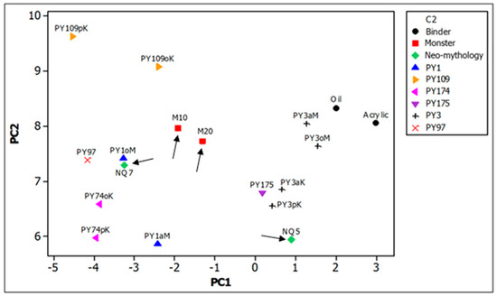 No Raman bands were observed for the yellow pigment in the M11 and M20 areas of “The monster”, but a characteristic emission spectrum was recorded for both areas, with a maximum at 525 nm and shoulders at about 537, 560, and 582 nm (Figure S4a, Supplementary Materials). This pattern has a good correspondence with the fluorescence spectrum previously reported for the isoindole yellow PY109 [6] and was also observed for the orange area M10 (Figure S4b, Supplementary Materials), where the red pigment PR10 (or PO38) was identified by Raman spectroscopy. The PCA of the emission spectra obtained on “The Monster” compared with those of yellow synthetic organic pigments in painting mock-up samples [6] shows nevertheless a certain distance in the space of the first two principal components between the spectra from the painting and those of the reference PY109 paints (Figure 10), which however do not in themselves form a very close group. Furthermore, a minor contribution to the emission spectra due to the additional red pigment recognised for M10 cannot be excluded.