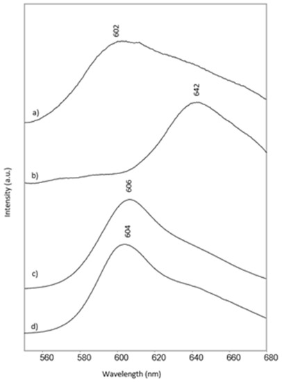 The second red organic pigment is a naphthol AS (or naphthol red) one and was identified in the NQ1 area on the basis of its Raman bands (Figure S2a, Supplementary Materials), corresponding to those of PR10 [4], but also of the orange pigment PO38 [15] which belongs to the same structural class. The emission maximum observed for the same area upon visible excitation is around 600 nm (Figure 9a). Correctly, it does not match any spectrum of our database, which actually does not contain those pigments.