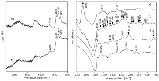 (right) MIR reflection spectra (after Kramers-Kronig transform) of: (a) blue area NQ2 (● band due to Prussian blue PB27); (b) orange area NQ8 (◆ bands due to PY1); (c) blue area NQ11 (■ bands due to ultramarine blue PB29); (d) green area M6; (left) NIR reflection spectra of: (e) blue area NQ11; (f) yellow area M11.