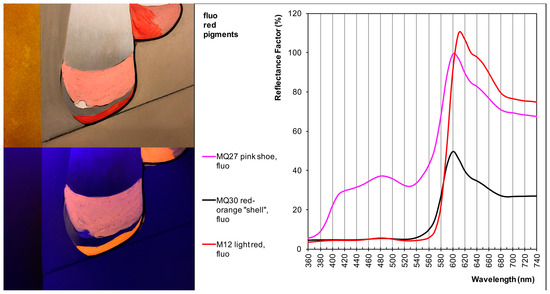 (top left) visible light detail and (bottom left) UVF detail of “The Daily Neo-Mythology”; (right) comparison of vis-RS spectra of fluorescent pigments (rhodamine 6G) in different red or pink areas of the two examined paintings. 420 nm intense shoulder in the fuchsia line (MQ27, regarding the shoe illustrated) due to titanium white in the mixture.