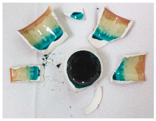 Blue experimental melt in a broken crucible, made from laboratory reagents mimicking the production of LMHK glass from refined, sodium-, and potassium-rich plant ashes (Table 2), melted at 1100 °C.